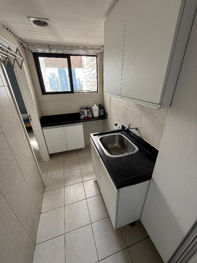 São 112m2, sendo 02 suítes - planta original com 3 quartos (ampliou a sala), lavabo, varanda, cozinha, área de serviço e dependência completa de empregados. 02 vagas soltas e cobertas.