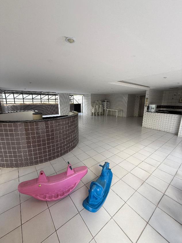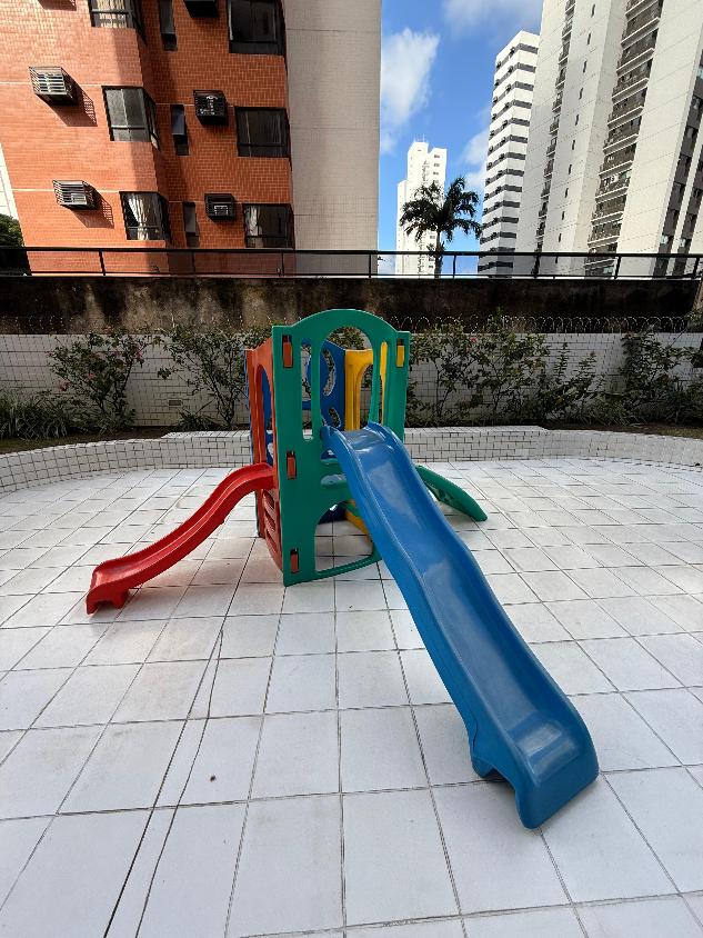 Prédio com piscina, playground e salão de festas.